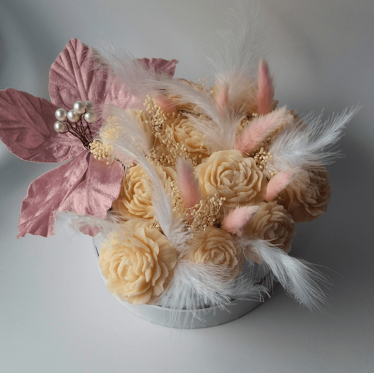 Η σύνθεση περιλαμβάνει διακοσμητικά στοιχεία από φυτικό κερί, διαμορφωμένα σε wax melt παιωνιες, σε συνδυασμό με αποξηραμένα φυσικά στοιχεία, διακοσμητικό αλεξανδρινό και πούπουλα, τοποθετημένα σε πολυτελές κουτί δώρου με minimal και κομψό χαρακτήρα. Κάθε στοιχείο έχει επιλεγεί και συνδυαστεί προσεκτικά, δημιουργώντας ένα εντυπωσιακό και αρμονικό αποτέλεσμα.
